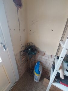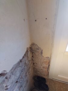 kupiliśmy stary dom i w pomieszczeniu wejściowym (wiatrołapie o pow. 2,40 m2) ściany były obłożone dookoła boazerią, pod którą znajdowała się folia kubełkowa oraz prawdopodobnie tynk renowacyjny. Po odkryciu wszystkiego stwierdziliśmy obecność pleśni, więc usunęliśmy całą okładzinę i skuliśmy tynki aż do gołej cegły/kamienia. Obecnie ściany są najbardziej wilgotne powyżej skutej części oraz wokół drzwi. Wilgoć nie jest teraz widoczna gołym okiem, ale mierzę ją wilgotnościomierzem. Chciałbym zapytać, co Państwo polecają w takiej sytuacji. Nie mam pewności, czy jest to wilgoć podciągana kapilarnie od dołu, czy wynika to z faktu, że ściana wokół drzwi jest dość cienka i przemarza, czy może problemem jest słaba cyrkulacja powietrza. Właśnie zamontowaliśmy tam dodatkowe drzwi, których wcześniej nie było, więc obawiam się, że sytuacja może się jeszcze pogorszyć. Co mogliby Państwo doradzić w takim przypadku?