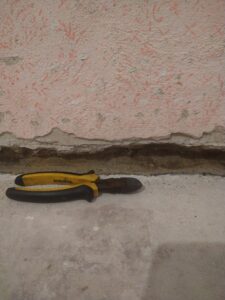 Dzień dobry. Po skuciu tynków zauważyliśmy, że w spoinie między podłogą a ścianą gromadzi się wilgoć. Jest to stary dom szeregowy, którego fundamenty są wykonane z kamienia. Izolacja została wykonana kilka centymetrów nad poziomem gruntu, podłoga jest zaizolowana, ale wody gruntowe przenikają przez szczelinę do góry (zobacz zdjęcie). Czy po wykonaniu iniekcji należy dodać jeszcze jakąś izolację do szczeliny między podłogą a ścianą, która nie posiada izolacji spodniej? Ewentualnie, czy iniekcja jest w tym przypadku odpowiednim rozwiązaniem? Dziękuję.